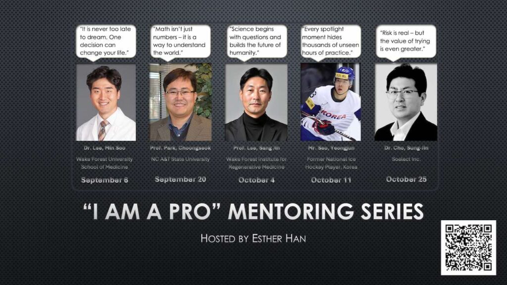 이럴 때 필요한 것이 바로 ‘현장의 목소리’입니다. 전문가가 직접 들려주는 생생한 경험담은 책이나 인터넷 정보로는 절대 얻을 수 없는 울림을 줍니다. 그린스보로 인근지역 한인회가 준비한 「나는 프로다」 멘토링 시리즈는 이러한 고민을 해결하고, 자녀가 진로를 구체적으로 그려볼 수 있는 좋은 출발점이 될 것입니다.
