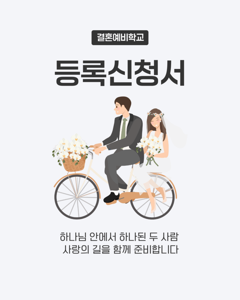 위드지저스교회 결혼예비학교 과정은 결혼을 앞두고 있는 예비부부에게 적합합니다. 특히 교회에 처음 다니시는 분들도 부담 없이 참여할 수 있도록 구성되어 있어, 신앙생활의 출발점으로도 좋습니다. 참여를 원하시는 분은 위 이미지의 등록 신청서를 클릭해서 작성해주시면 되고 타 주에 계신 분들은 Zoom으로도 진행이 가능하니 문의사항이 있으면 withjesuschurch2024@gmail.com 으로 연락주시기 바랍니다.