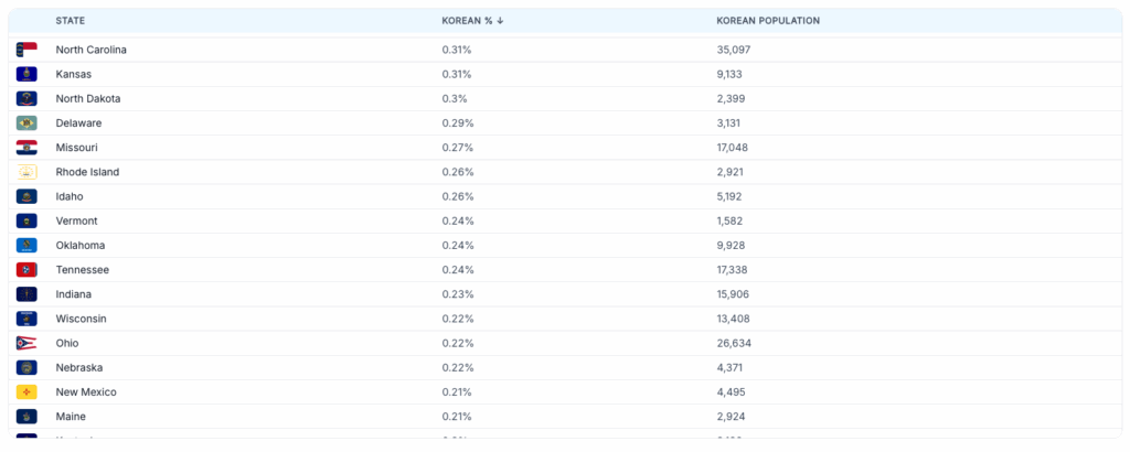 ‘State rankings: Korean Population by State 2025’에 따르면, 노스캐롤라이나 주 전체 한인 인구는 35,097명으로, 전체 인구의 약 0.31%를 차지하고 있으며 대략적으로 전체 주 가운데 대략 17위에 해당하고 있습니다.