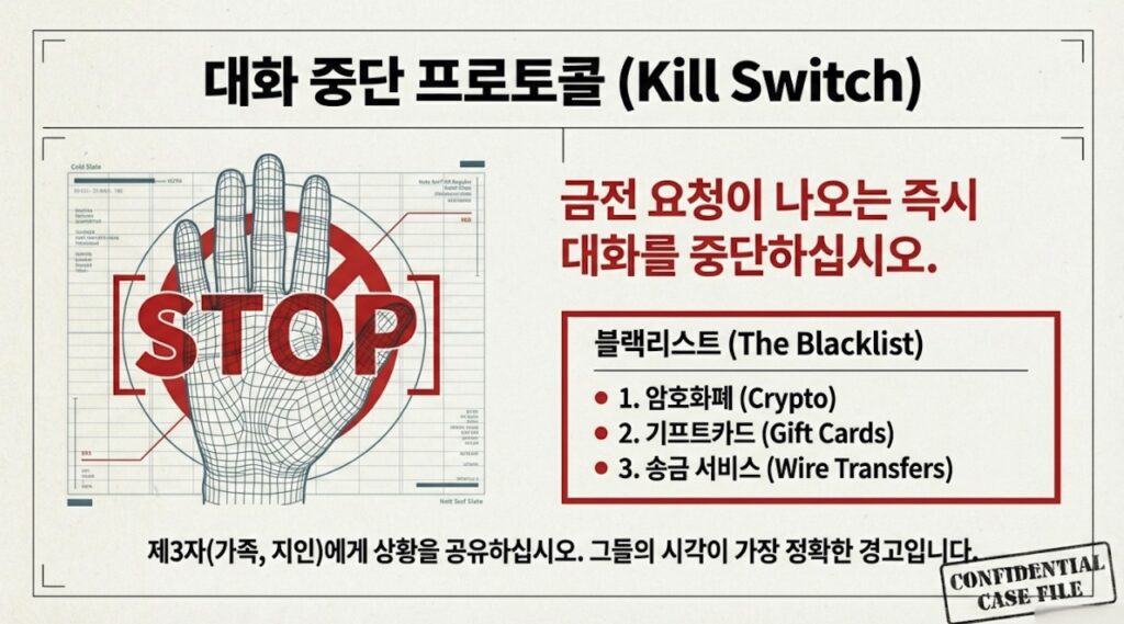 금전 요청이 나오면 즉시 대화를 중단하십시오. 특히 암호화폐, 기프트카드, 송금 서비스 요구는 100% 사기라고 보셔도 됩니다. 가족이나 지인에게 상황을 공유하십시오. 제3자의 시각이 가장 빠른 경고 신호가 될 수 있습니다.