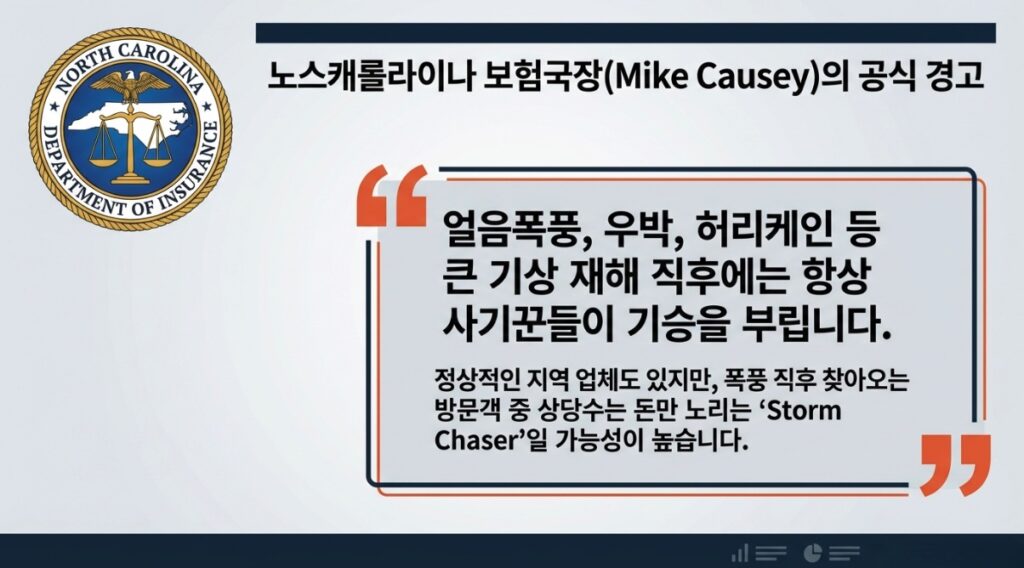 노스캐롤라이나 보험국장 Mike Causey는 폭풍 이후 무료 지붕 점검을 해주겠다고 방문하는 사람들을 특히 조심하라고 당부했습니다. 얼음폭풍, 우박, 허리케인 등 큰 기상 재해가 발생할 때마다 같은 유형의 사기가 반복된다는 설명입니다. 그는 지역에서 정상적으로 영업하는 합법적인 업체도 있지만, 상당수는 돈만 노리는 사기꾼이라고 분명히 말했습니다.
