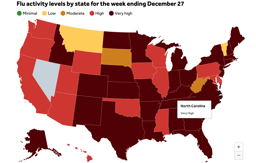 미국 질병통제예방센터(CDC) 발표에 따르면, 현재 거의 모든 주에서 독감 활동 수준이 높음 또는 매우 높음 단계에 있습니다. 병원을 찾은 환자 중 발열과 기침, 인후통 등 독감 유사 증상으로 방문한 비율이 1997~1998 시즌 이후 최고치를 기록했습니다.